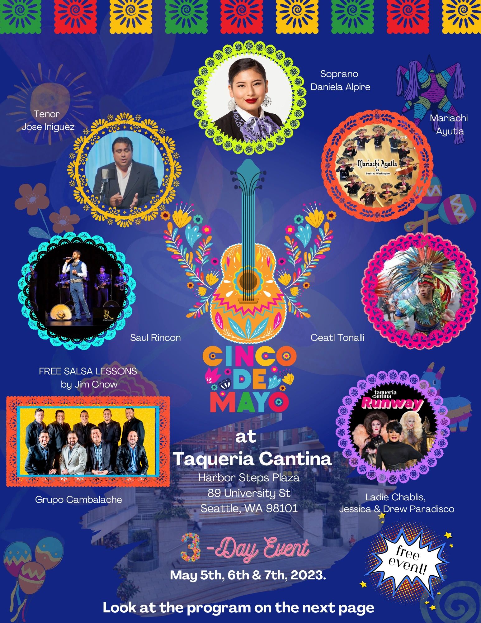 5 Seattlearea Cinco de Mayo celebrations, and more May community events Entertainment . Register 2025 Cinco De Mayo Run Against All Odds SEATTLE Join us on 05/03/2025 May 3, 2025 (7:30 p.m.) Eastlake (1.3 miles N) A ticket to the Cinco de Mayo Party Cruise by Waterways Cruises includes a drink, a taco bar, dessert, 2.5 hours of views, a DJ, and a no-host bar, departing from Chandler's Cove, 901 Fairview Ave